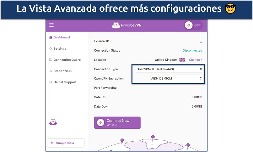 Las configuraciones de seguridad personalizables de PrivateVPN te permiten optimizar tu conexión en Rusia. Puedes reducir la encriptación de AES de 256 bits a 128 bits para obtener mejores velocidades mientras mantienes seguros tus datos. También permite conexiones a través del puerto 443, combinando el tráfico de VPN con el HTTPS regular para evitar ser detectado. Si un protocolo está bloqueado, puedes cambiar a alternativas como L2TP, que a menudo funciona mejor en redes restrictivas debido a su encriptación más simple.