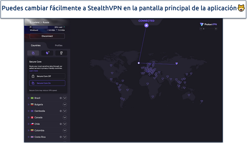 Secure Core de Proton VPN mejora la seguridad al dirigir primero tu tráfico a través de servidores seguros en países con políticas de privacidad favorables. Esto hace que sea significativamente más difícil para las autoridades rusas o los ISP rastrear tu ubicación real. Aunque Secure Core puede ralentizar tu velocidad más que los servidores regulares, ofrece una privacidad más fuerte y te permite acceder con seguridad a tus sitios web favoritos, tanto dentro como fuera de Rusia.